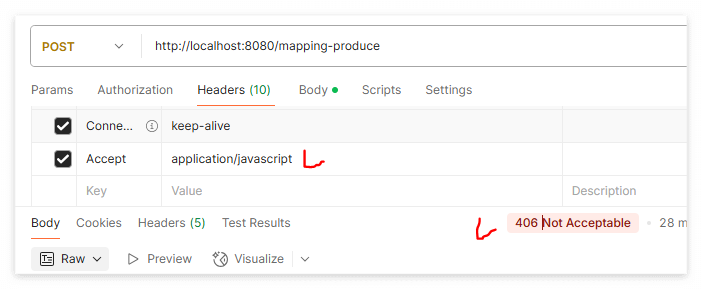 → HTTP์ Accept๊ฐ ์ง์ ํ produces์ ๋ง์์ผ ํ๋ค. - code
