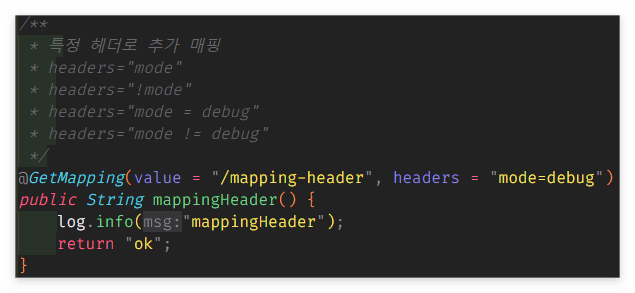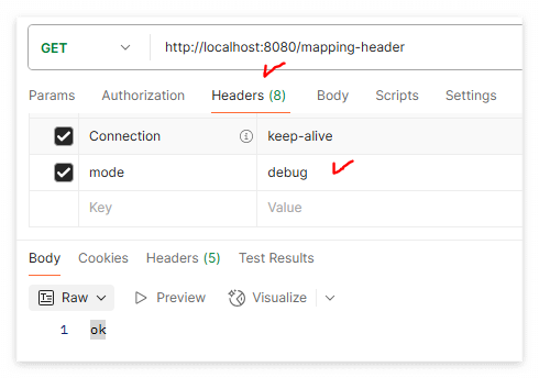 @GetMapping(value = "/mapping-header", headers = "mode=debug")