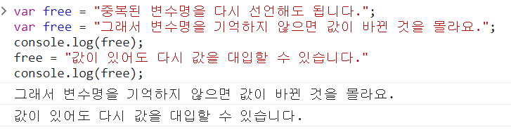 [JS]변수타입 var, let, const 💡 let과 const를 사용되길 권고되고 있지만 아직은 var를 사용하시는 분들이 압도적으로 많습니다.하지만 JS코드가 길수록, var는 너무나 자유로운 변수타입이기에 코드를 통제하기 쉽지 않습니다.그럼 왜 그런지 세가지 변수타입의 차이를 알아보겠습니다. 시작 전에 선언과 초기화의 차이는var declare;변수명; 하는 것을 선언이라 합니다. declare = "초기화";변수 선언시 값을 대입하는 것을 초기화라고 합니다. var declare = "선언과 초기화를 동시에";보통 이렇게 선언과 초기화를 동시에 해줍니다.이유는 초기화 되지 않은 변수는사용시 오류가 나기 때문입니다 var변수명 중복⭕문제는 변수가 중복된 지 모르면 값이 바뀌어버린다는 겁니다. let 변수명 중복 ❌중복시 오류 발생.. ✨ UI/💛 JS 2023.06.10