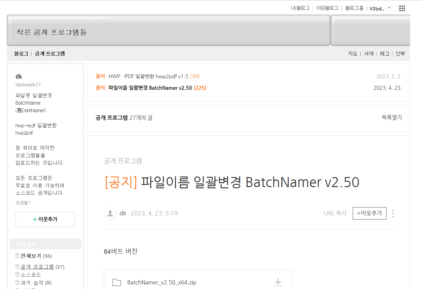 [파일이름 일괄변경]BatchNamer https://blog.naver.com/PostView.naver?blogId=darkwalk77&logNo=223082595848&categoryNo=3&parentCategoryNo=-1&viewDate=¤tPage=&postListTopCurrentPage= 파일이름 일괄변경 BatchNamer v2.5064비트 버전 32비트 버전 여러개의 파일명을 한번에 바꿔주는 프로그램입니다. 무료 공개 프로그램으로 경...blog.naver.com감사하고 실력 좋으신 개발자분이 넓은 아량으로 뿌려주는 프로그램입니다.보통 개발산출물을 공유드라이브를 보잖아요. 괜히 그거 잘못하다 수정하시지 말고 바탕화면에 폴더 하나 만들어서 필요한 것만 모아서 보는 걸 추천드립니다. 그 때 헷갈리니까 이런 프로그램을.. 📑 개발 사전/🛫 사이트 모음 2025.08.24
