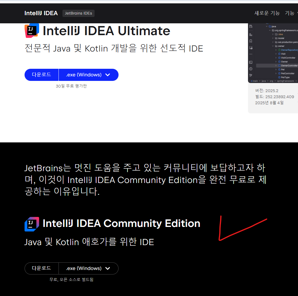 [IntelliJ]VScode에서 IntelliJ로 넘어가며 (무료버전 설치와 설정) 들어가기에 전..주저리주저리( •̀ ω •́ ) intelliJ 카테고리를 파게된 이유는 바로비싸서 못 쓰던 인텔리제이를 사주는 회사에 입사하게되었습니다! 기쁜 맘도 잠시 단축키부터 에러를 겪게 되었는데..VScode keymap plugin을 설치해도 자동설정이 안된다는 사실을 1시간 반 뒤 알게될 줄이야 smart tomcat plugin이 왜 회사에서는 안 보였을까..미스테리 하여 무료버전이라도 집에서 설치해서 시도해보자이렇게..되었습니다.머리에서 떨어지질 않아.. 마치 게임 일일퀘스트처럼.. 짤을 넣은 개발글이 잘 읽히길래 저도 재밌게 적어보고자 합니다. GOGO❗ 무료버전 설치 구글에 intelliJ 검색해 들어가서 화면 아래 무료버전을 다운로드 합니다.두근두근업데이트가 필요한 툴들은 그.. 🛠 도구/🟥 IntelliJ IDEA 2025.08.18