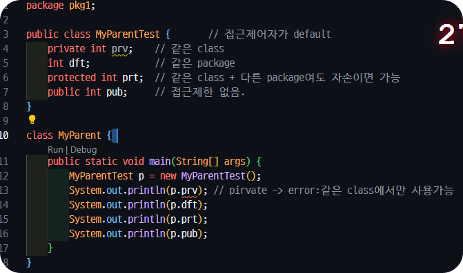 - 그리고 (다른 package여도) 자손 class 에서 접근 가능.