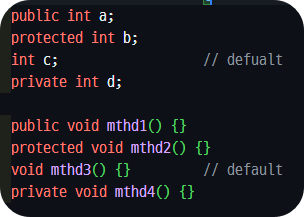 → 여기서 말하는 건 전역변수와 메서드를 말합니다(메서드 안에서는 접근제한자가 필요없으니까요). - 전역변수(클래스에서 method밖에 선언된 변수)는 private을 사용합니다.