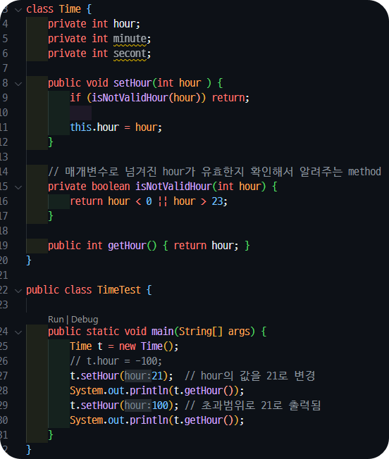 - 그래서 접근제어자 범위를 좁힐 수 있다면 되도록 좁히는 게 좋다.(특히 변수)