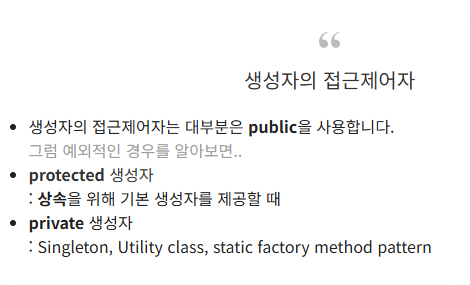 - 메서드는 생성자를 포함해서 public을 사용하는 게 일반적입니다.
