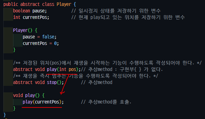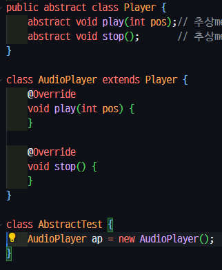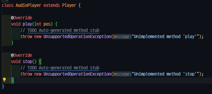 - 구현부{ }는 AudioPlayer에서 만들면 됨.