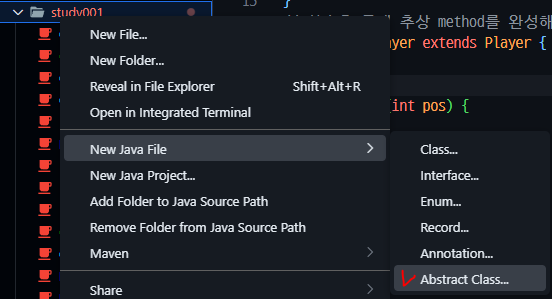 - class명 앞에 abstract가 붙는다(class 만들 때 abstract class로 생성).