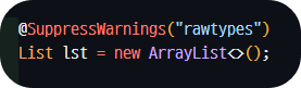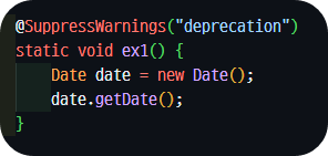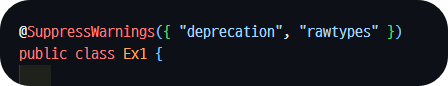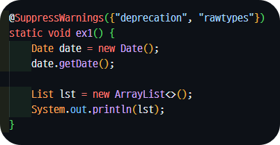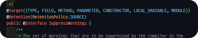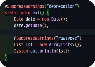 💡 여러 경고 한번에 안 뜨게 하기 ( { "경고1", "경고2" } )({ })안에 경고를 묶고 메서드명 위에 적으면 된다. 클래스 전체에 해당 경고 메시지를 안 뜨게 싶게 하고 싶다면 클래스명 위에 적으면 된다.