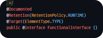 - @FunctionalInterface는 이 제약을 지켰는 지 컴파일러가 체크하게 해준다.