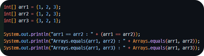 - 이차원 이상의 배열은 deepEquals()를 사용해서 같은 지 확인해야 합니다.