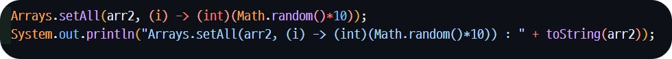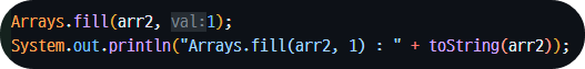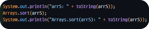 여기 밑으로는 Arrays.toString()코드를 좀 더 간단히 쓰고자 아래와 같은 함수를 만들어 사용했습니다.