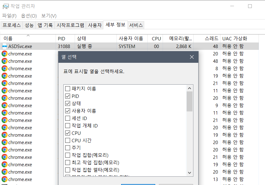 💡 스레드가 하나일 때 Single Thread Process, 여러 개일 때는 Multi Thread Process라고 한다. 작업관리자-세부정보-상태 우클릭-열선택-스레드 체크 하면 실행중인 프로세스들의 스레드 갯수를 확인할 수 있다.