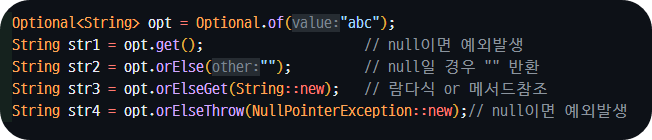 ❗Optional.of(null)로 생성시 NullPointerException이 발생하므로 비권장.
