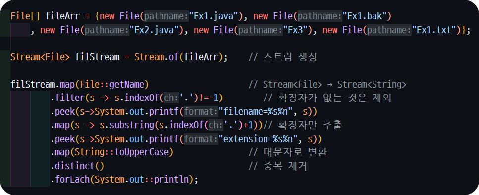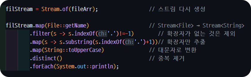 → 스트림은 소모되면 재사용할 수 없기에, 다시 스트림으로 초기화 하였다. - .map(File::getName)