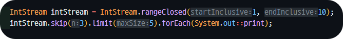 | Stream<T> limit(long maxSize) | 스트림 일부 잘라내기. | |