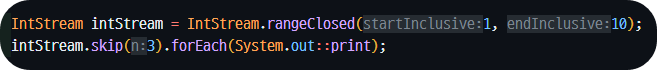 | Stream<T> skip(long n) | 스트림 일부 건너뛰기. | |