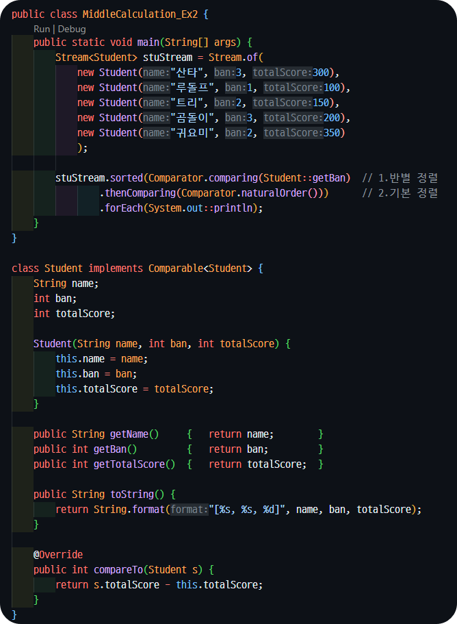 - thenComparing()의 기본정렬은 Student클래스에 정의된 compareTo()이다. (총점 높은 순)
