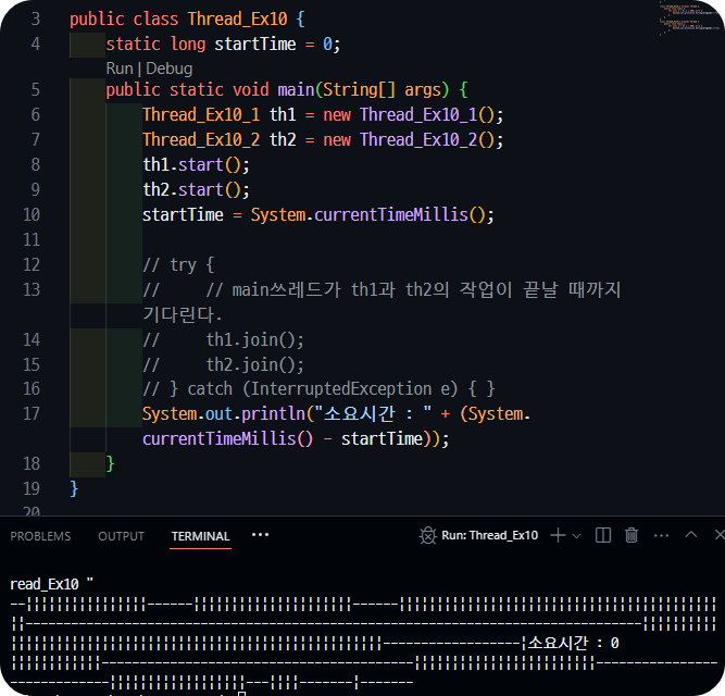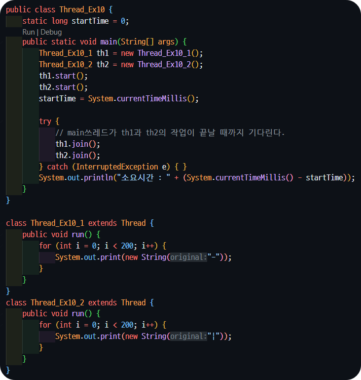 만약 join()을 사용하지 않으면❓main쓰레드가 th1과 th2를 기다리지 않고 중간에 실행되는 것이 확인된다.
