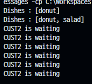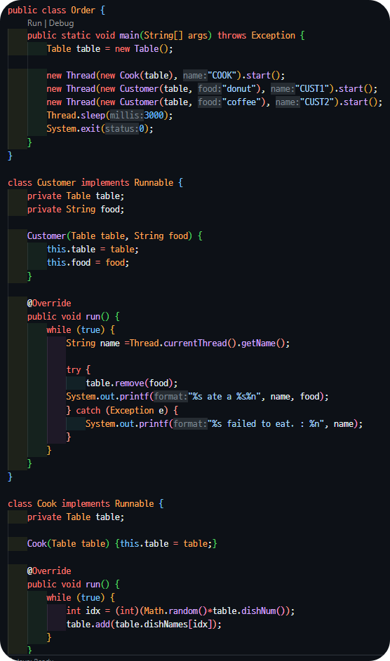 ํ ์ด๋ธ์์ ์์์ ์น์ฐ๋ คํ๋๋ฐ while (dishes.size() == 0) { ์ ์๊ฐ ์์ผ๋ฉด ๋ ๊ธฐ๋ค๋ฆฌ๊ณ ๋ค๋ฅธ ์ฐ๋ ๋๋ฅผ ์คํํ๊ฒ ํฉ๋๋ค.