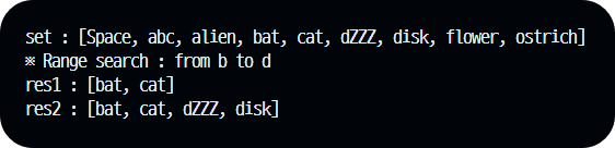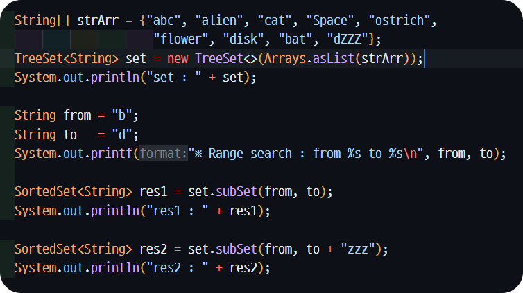 → ("b", "d") b에서 d(전)까지 범위를 반환햇다. - set.subSet("b", "d" + "zzz");