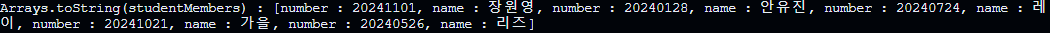 Arrays.toString(studentMembers)로 출력해서 출력하면 줄바꿈없이 데이터가 출력된 것이 보입니다.