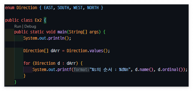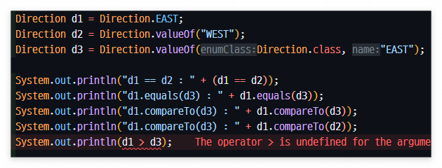 → enum의 요소는 사실상 생성자이다. 그래서   Direction1.SOUTH.getValue()  와 같이 적을 수 있는 것이다.
