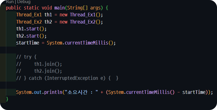 💡싱글 쓰레드와의 차이싱글 쓰레드 코드 순차적으로 출력이 실행되었다.