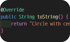 - Circle 클래스에서 toString() 메서드를 오버라이드하지 않으면, Circle 객체의 toString() 호출 결과는 Circle@1a2b3c4와 같은 형태로 출력됩니다.