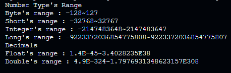 .append("Double's range : " + Double.MIN_VALUE + "~" + Double.MAX_VALUE + "\n");
