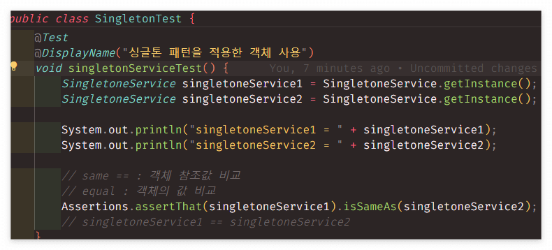💡 스프링 컨테이너에 객체가 Bean으로 등록될 때 자동으로 싱글톤 패턴으로 만들어 준다.