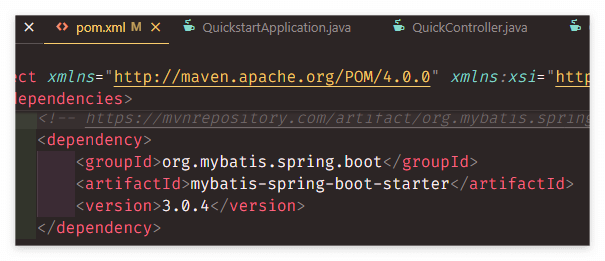 - ๋ฉ์ด๋ธ ๋ฆฌํฌ์งํ ๋ฆฌ์์ Mybatis Spring Boot Starter๋ฅผ ๊ฒ์ํด ๋ค์ด๊ฐ ์์กด์ฑ์ฝ๋๋ฅผ ๋ณต์ฌํด์จ๋ค.