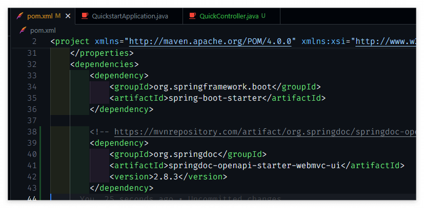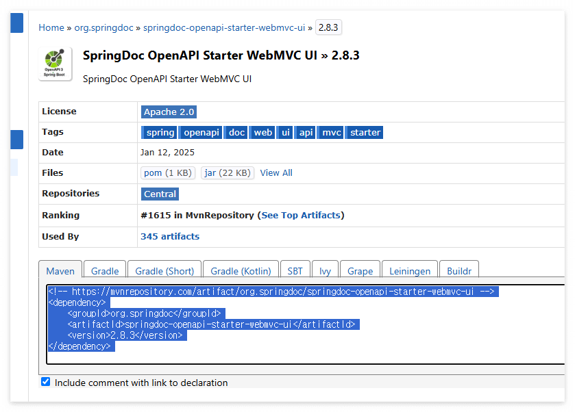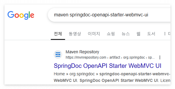 - ๊ตฌ๊ธ์ maven springdoc-openapi-starter-webmvc-ui ์ ๊ฒ์ํด ๋ค์ด๊ฐ๋ค.