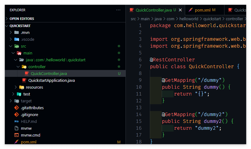 - controller ํจํค์ง์ ๊ทธ ์์ QuickController ํด๋์ค ๋ง๋ค๊ณ ๊ฐ๋จํ ๋ฉ์๋๋ฅผ ๋ง๋ค์๋ค.