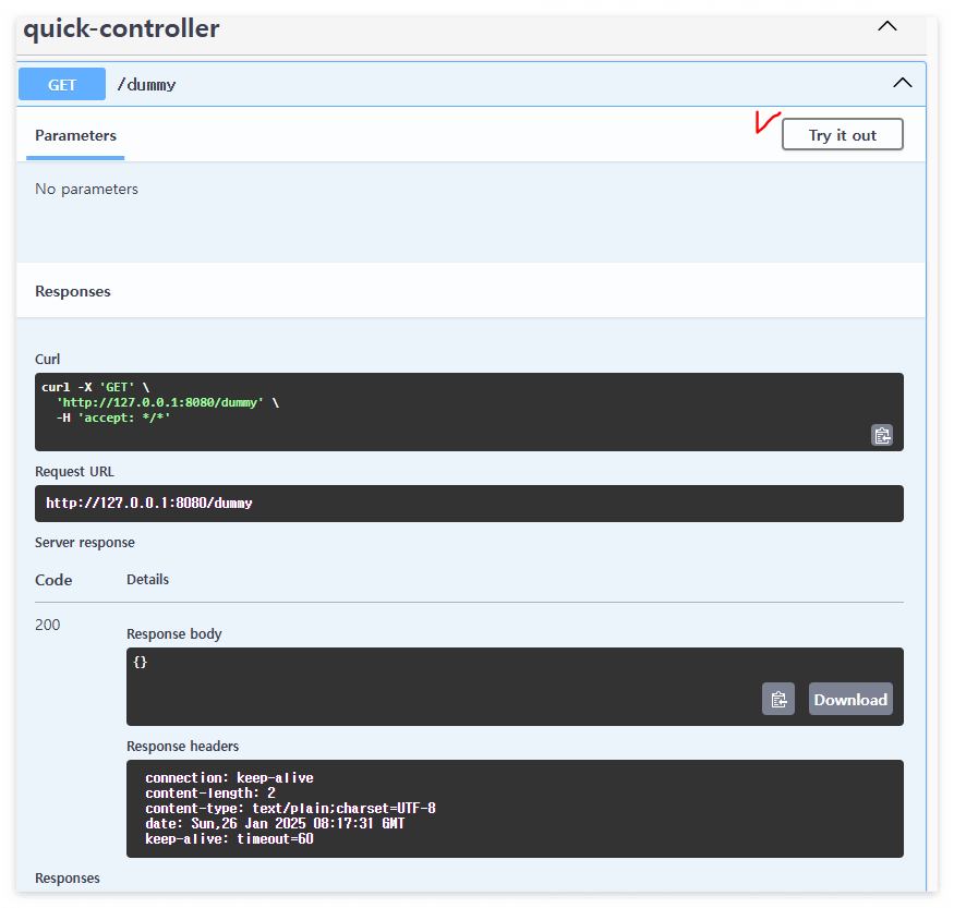 - swagger๋ฅผ ์ด์ฉํด ๊ฐ๋จํ๊ฒ ๋ฉ์๋๋ฅผ ์คํํด ๋ณผ์ ์๋ค.